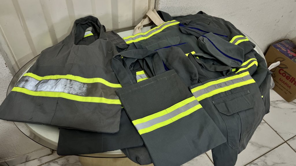 Os uniformes antigos das empresas Ambiental Ceará e Ambiental Crato estão ganhando um novo destino desde março de 2024. De lá para cá, as duas organizações vêm mantendo uma parceria com a ONG Mamãe Margarida, que reúne artesãs do bairro Salesianos, em Juazeiro do Norte. Com quase 50 anos de história, a instituição recebe os uniformes em desuso e transforma em novos materiais, como mochilas, bolsas e cordões para crachá.